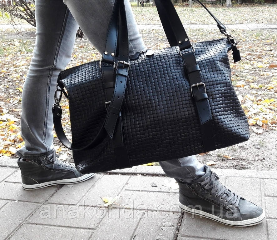Сумка з натуральної шкіри дорожня з тисненням 3D — сумка шкіряна чоловіча, жіноча, унісекс чорна під ноутбук
